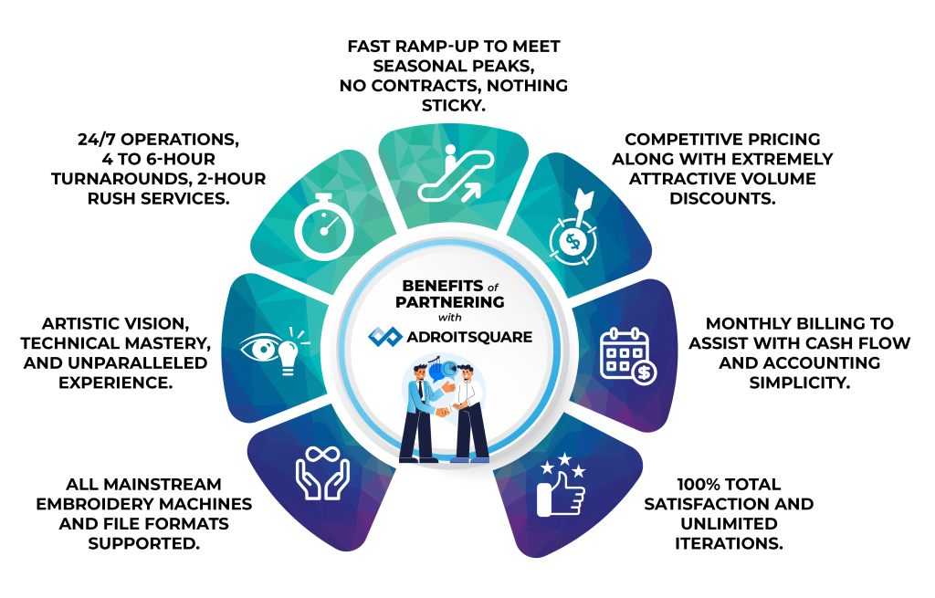 At Adroitsquare, we combine years of expertise with a commitment to quality. Our experienced team uses state-of-the-art software and equipment to ensure every embroidery project meets the highest standards. Our focus on customer care, attention to detail, and on-time delivery sets us apart from competitors.